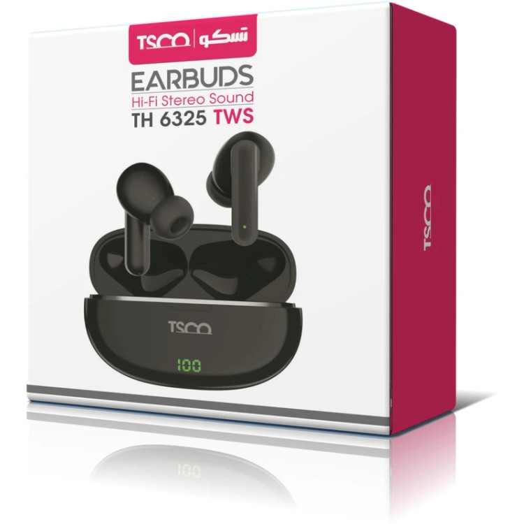هدفون بلوتوثی تسکو مدل TH 6325 یک هدست بیسیم True Wireless Stereo (TWS) است که برای ارائه تجربه صوتی با کیفیت و مکالمات شفاف طراحی شده. این ایربادزها با طراحی توگوشی و ابعاد کوچک (هر ایرباد ۳.۲ گرم، کیس ۳۹.۷ گرم)، استفاده راحت و ایمن را برای کاربری عمومی، مکالمه و پخش موسیقی فراهم میکنند. جنس بدنه از پلاستیک ساخته شده و دارای نمایشگر دیجیتال LED برای نشان دادن وضعیت باتری کیس است که کاربری آن را آسان میکند.