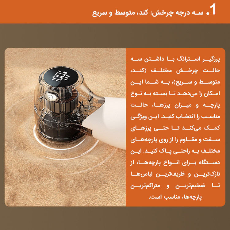 پرزگیر استرانگ مدل MQ-01 با داشتن سه حالت چرخش مختلف (کند، متوسط و سریع)، به شما این امکان را میدهد تا بسته به نوع پارچه و میزان پرزها، حالت مناسب را انتخاب کنید. این ویژگی کمک میکند تا حتی پرزهای سفت و مقاوم را از روی پارچههای مختلف به راحتی پاک کنید. این دستگاه برای انواع پارچهها، از نازکترین و ظریفترین لباسها تا ضخیمترین و متراکمترین پارچهها، مناسب است.