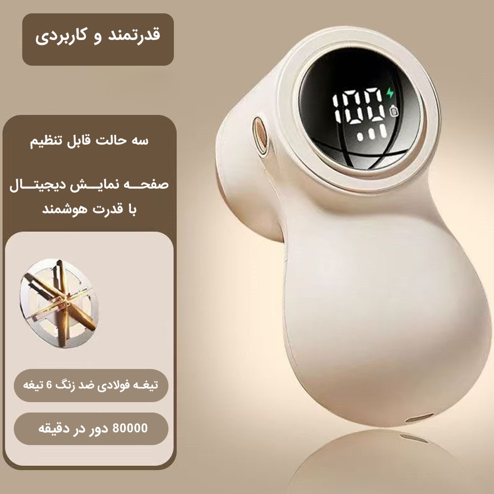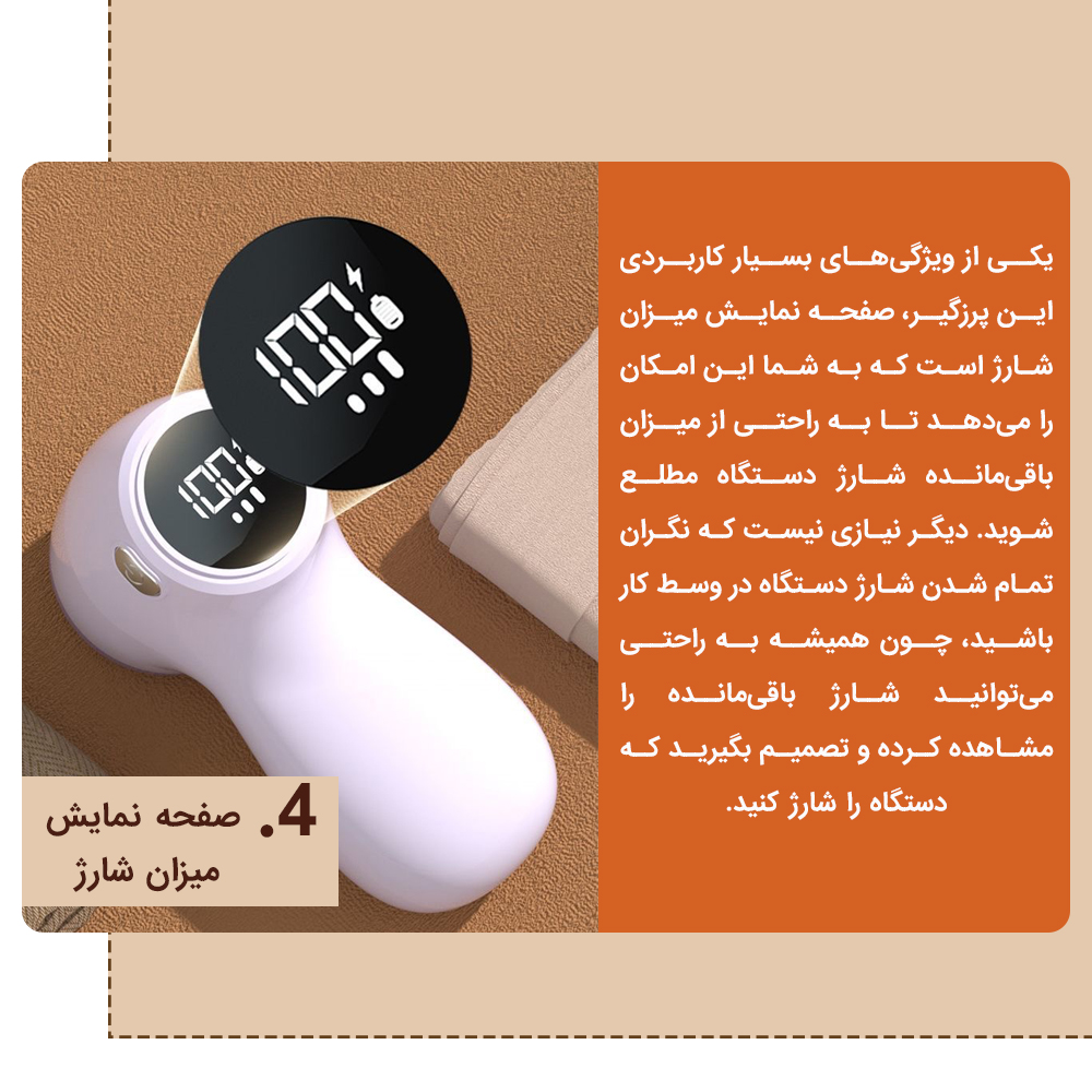یکی از ویژگیهای بسیار کاربردی این پرزگیر، صفحه نمایش میزان شارژ است که به شما این امکان را میدهد تا به راحتی از میزان باقیمانده شارژ دستگاه مطلع شوید. دیگر نیازی نیست که نگران تمام شدن شارژ دستگاه در وسط کار باشید، چون همیشه به راحتی میتوانید شارژ باقیمانده را مشاهده کرده و تصمیم بگیرید که دستگاه را شارژ کنید.
