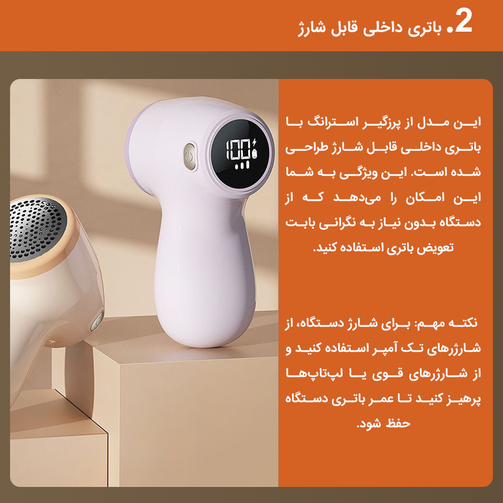 این مدل از پرزگیر استرانگ با باتری داخلی قابل شارژ طراحی شده است. این ویژگی به شما این امکان را میدهد که از دستگاه بدون نیاز به نگرانی بابت تعویض باتری استفاده کنید. با استفاده از شارژر مناسب، دستگاه را شارژ کنید و برای مدت طولانی از آن بهرهبرداری کنید. نکته مهم: برای شارژ دستگاه، از شارژرهای تک آمپر استفاده کنید و از شارژرهای قوی یا لپتاپها پرهیز کنید تا عمر باتری دستگاه حفظ شود.