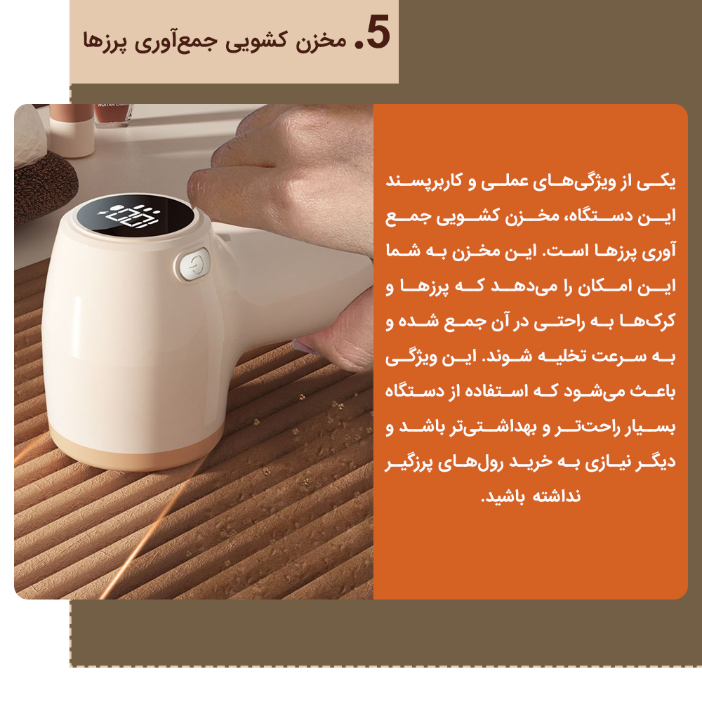 یکی از ویژگیهای عملی و کاربرپسند این دستگاه، مخزن کشویی جمعآوری پرزها است. این مخزن به شما این امکان را میدهد که پرزها و کرکها به راحتی در آن جمع شده و به سرعت تخلیه شوند. این ویژگی باعث میشود که استفاده از دستگاه بسیار راحتتر و بهداشتیتر باشد و دیگر نیازی به خرید رولهای پرزگیر نداشته باشید.